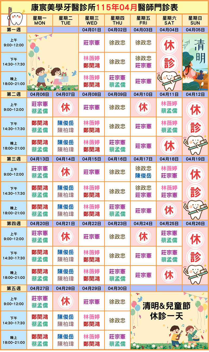 2026-04-01 115年04月份 醫師看診時間表出爐~ 若相關疑問或問題也可以多加利用【FB私訊】的功能來諮詢唷! 我們有提供專業的「衛教師」會與您聯繫唷! 看診預約可歡迎使用預約系統或電話預約掛號 康銳牙醫 門診預約專線:06-3117111 門診地址:台南市永康區中華二路189號 康宸牙醫 門診預約專線:06-5988333門診地址:台南市新化區忠孝路162號 Back