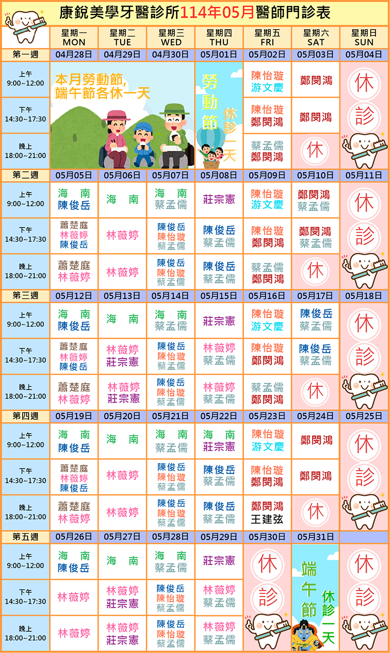2025-04-28 114年05月份 醫師看診時間表出爐~ 若相關疑問或問題也可以多加利用【FB私訊】的功能來諮詢唷! 我們有提供專業的「衛教師」會與您聯繫唷! 看診預約可歡迎使用預約系統或電話預約掛號 康銳牙醫 門診預約專線:06-3117111 門診地址:台南市永康區中華二路189號 康宸牙醫 門診預約專線:06-5988333門診地址:台南市新化區忠孝路162號 Back