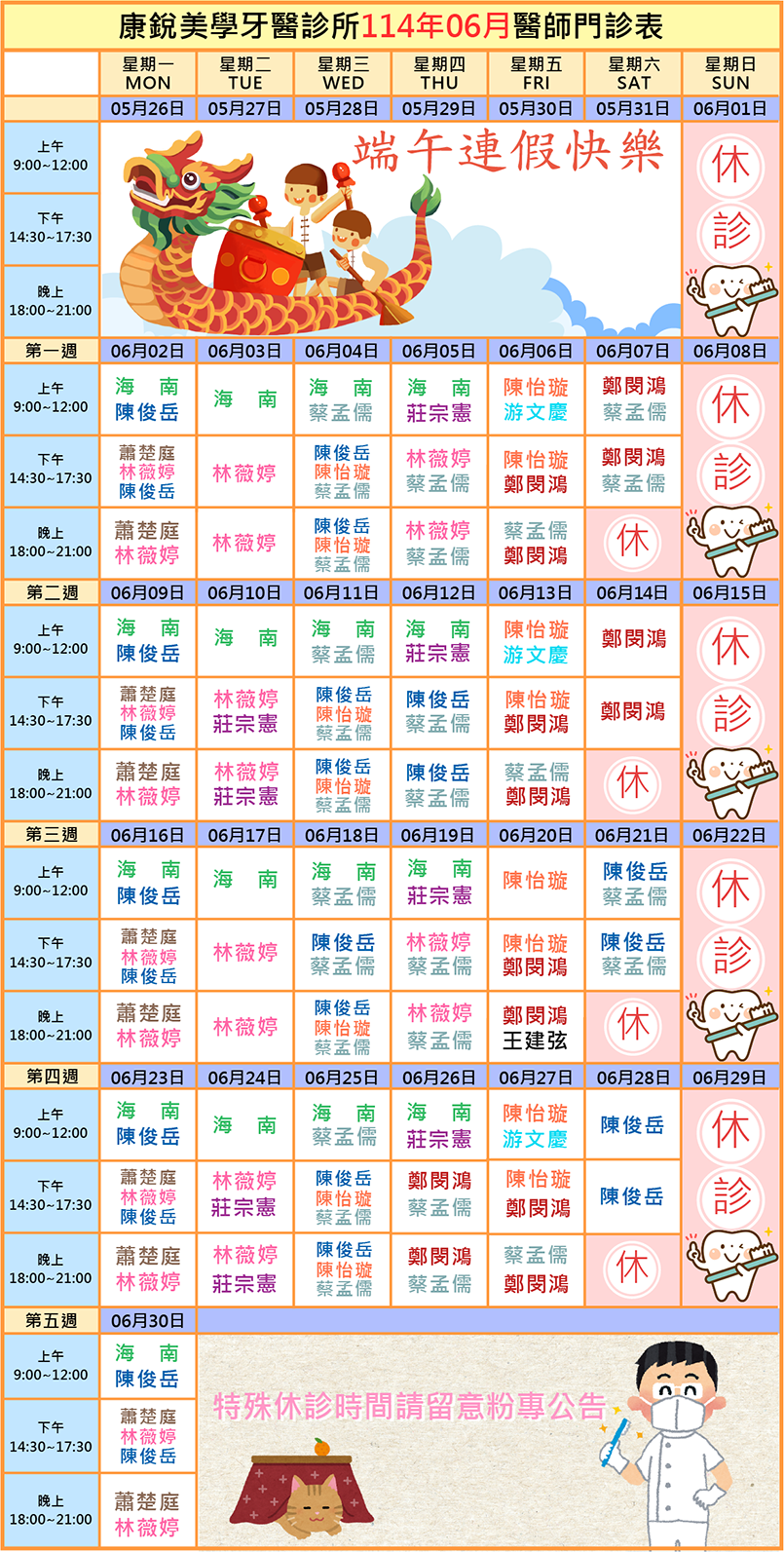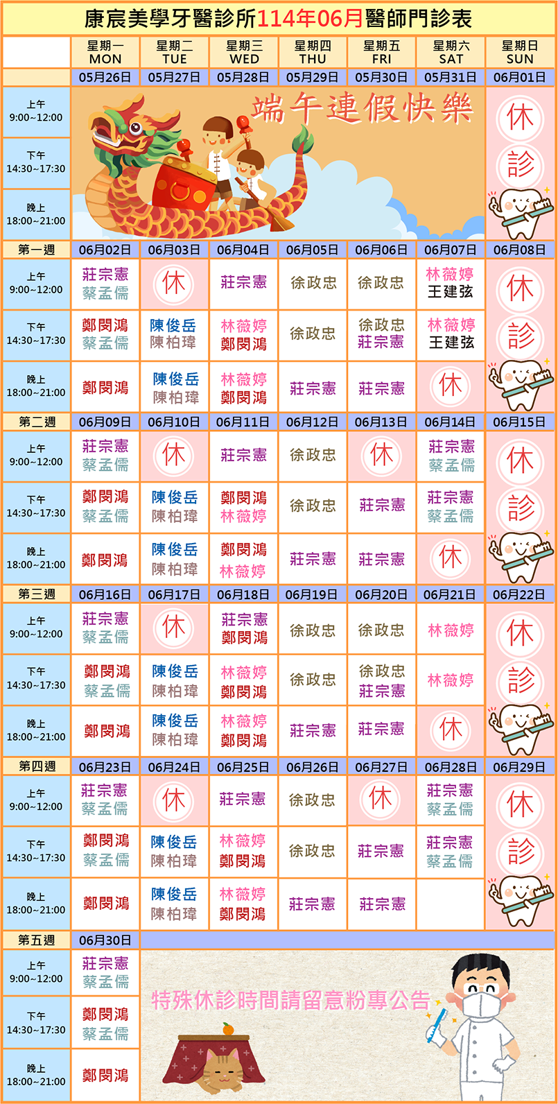 2025-05-29 114年06月份 醫師看診時間表出爐~ 若相關疑問或問題也可以多加利用【FB私訊】的功能來諮詢唷! 我們有提供專業的「衛教師」會與您聯繫唷! 看診預約可歡迎使用預約系統或電話預約掛號 康銳牙醫 門診預約專線:06-3117111 門診地址:台南市永康區中華二路189號 康宸牙醫 門診預約專線:06-5988333門診地址:台南市新化區忠孝路162號 Back
