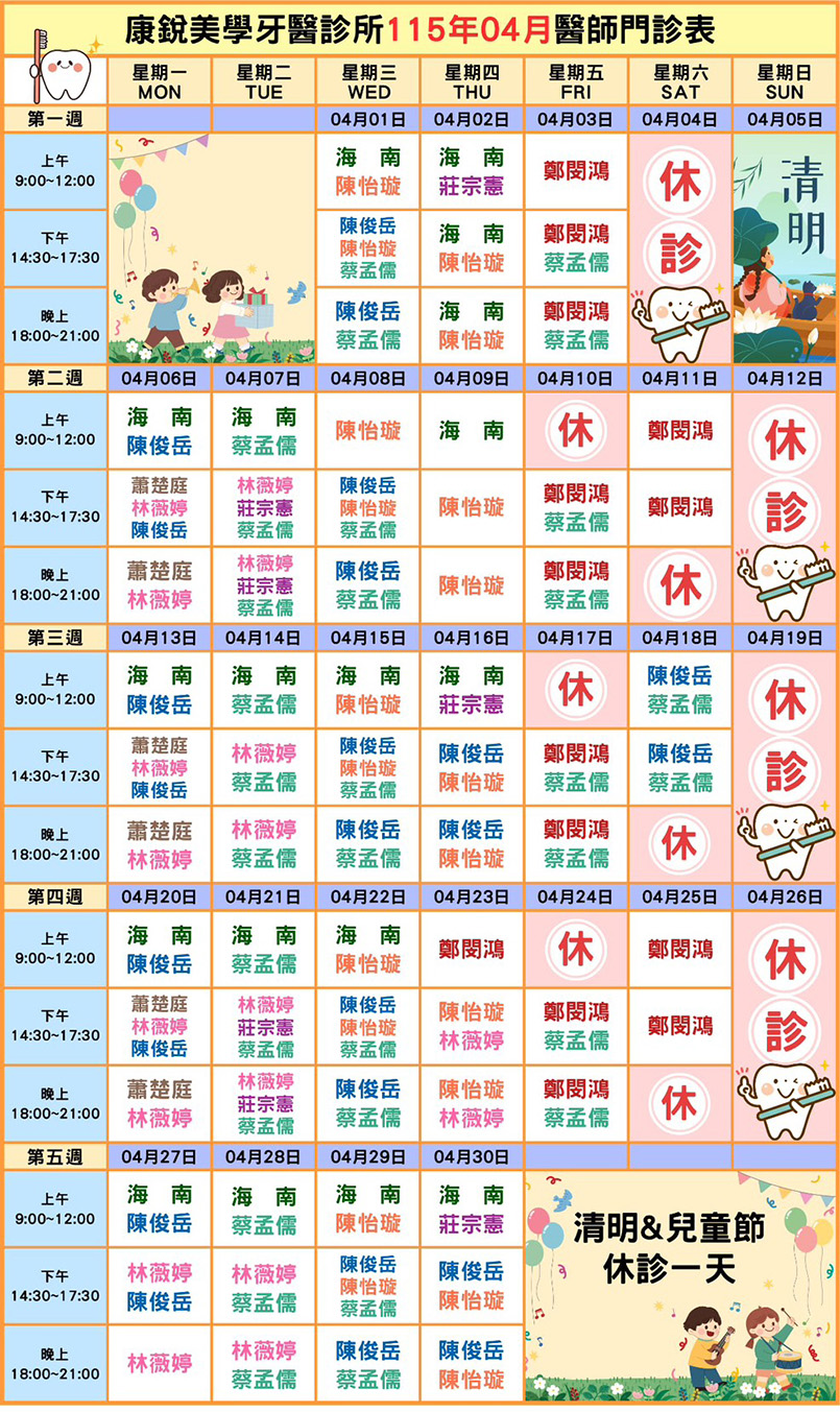 2026-04-01 115年04月份 醫師看診時間表出爐~ 若相關疑問或問題也可以多加利用【FB私訊】的功能來諮詢唷! 我們有提供專業的「衛教師」會與您聯繫唷! 看診預約可歡迎使用預約系統或電話預約掛號 康銳牙醫 門診預約專線:06-3117111 門診地址:台南市永康區中華二路189號 康宸牙醫 門診預約專線:06-5988333門診地址:台南市新化區忠孝路162號 Back